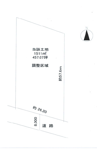 西庄内高塚線8m道路に約26m面す。東名阪鈴鹿IC2800m、公営水道、、プロパンガス、中部電力